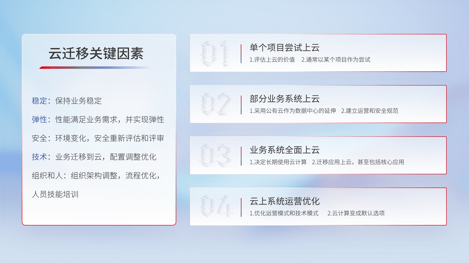 结合实际业务,,从规划设计、、、、云平台选型、、、云原生改造、、数据迁移、、、集成交付,,,迁移全过程为客户识别最佳上云路径,,,,做好风险识别管理,,,,设计网络架构、、、身份权限、、、安全审计合规、、、操作审计、、日志审计、、、、监控告警策略、、、、多站点容灾设计等,,,对云上基础设施进行整体规划,,,,提升IT治理水平,,,,以满足弹性、、高可用、、、高性能的需求。。。。