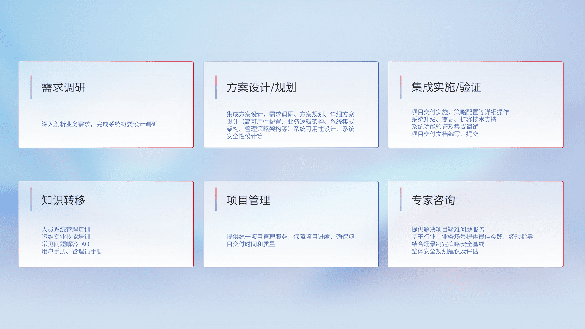 针对客户行业特性,,,,将宏观的安全战略和需求,,,通过专业的交付服务,,,,实现项目落地,,,为客户提供标准规范的集成交付服务。。。